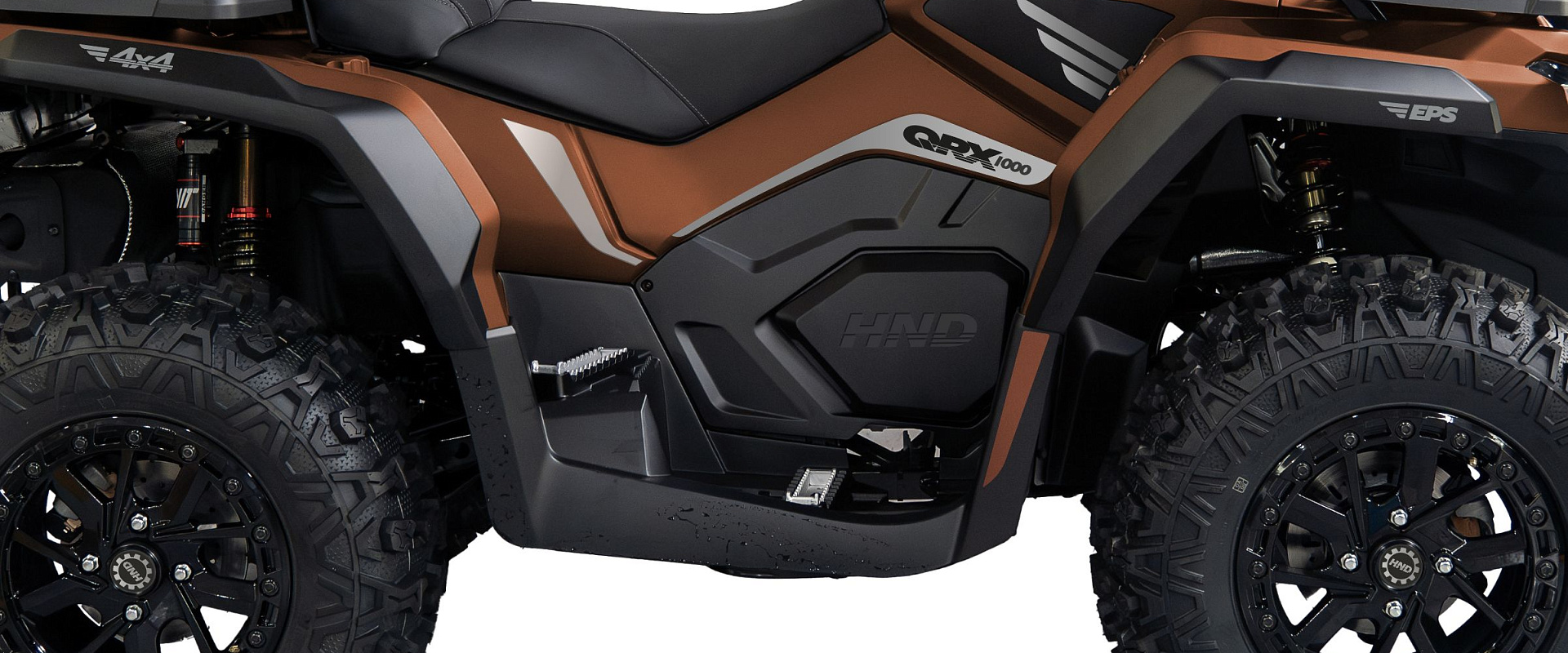 Квадроциклы QRX разрабатывались дизайн-бюро, на счету которого множество проектов топовых брендов, а сам квадроцикл прошел серию испытаний и адаптаций под Российские условия. QRX имеет повышенный дорожный просвет, блокировки переднего и заднего дифференциалов, базовую защиту днища, а также обогревы ручек и курка газа. Эргономически выверенное пространство водителя, с большим TFT-дисплеем, а также 2 бардачка для хранения, большой бензобак и пр. Подробнее